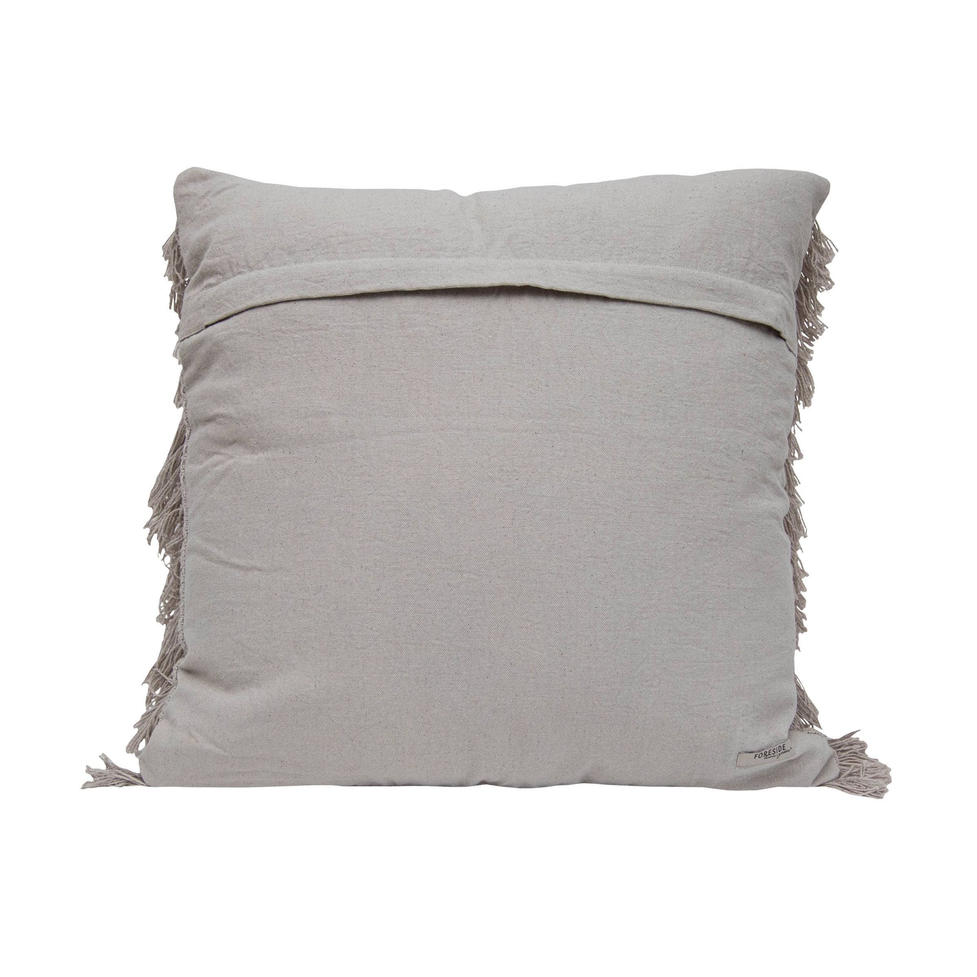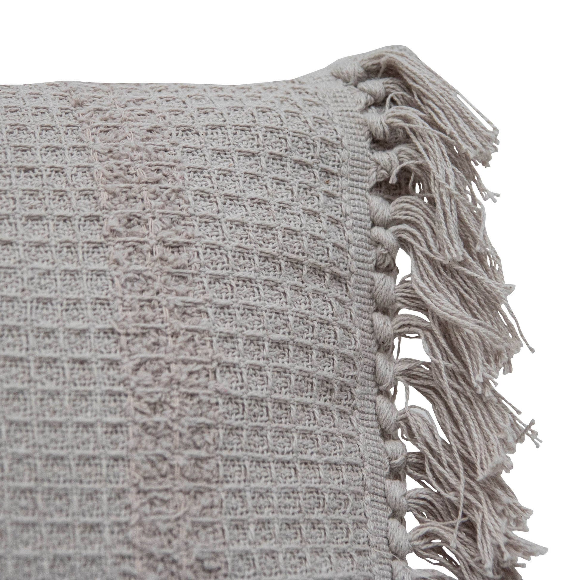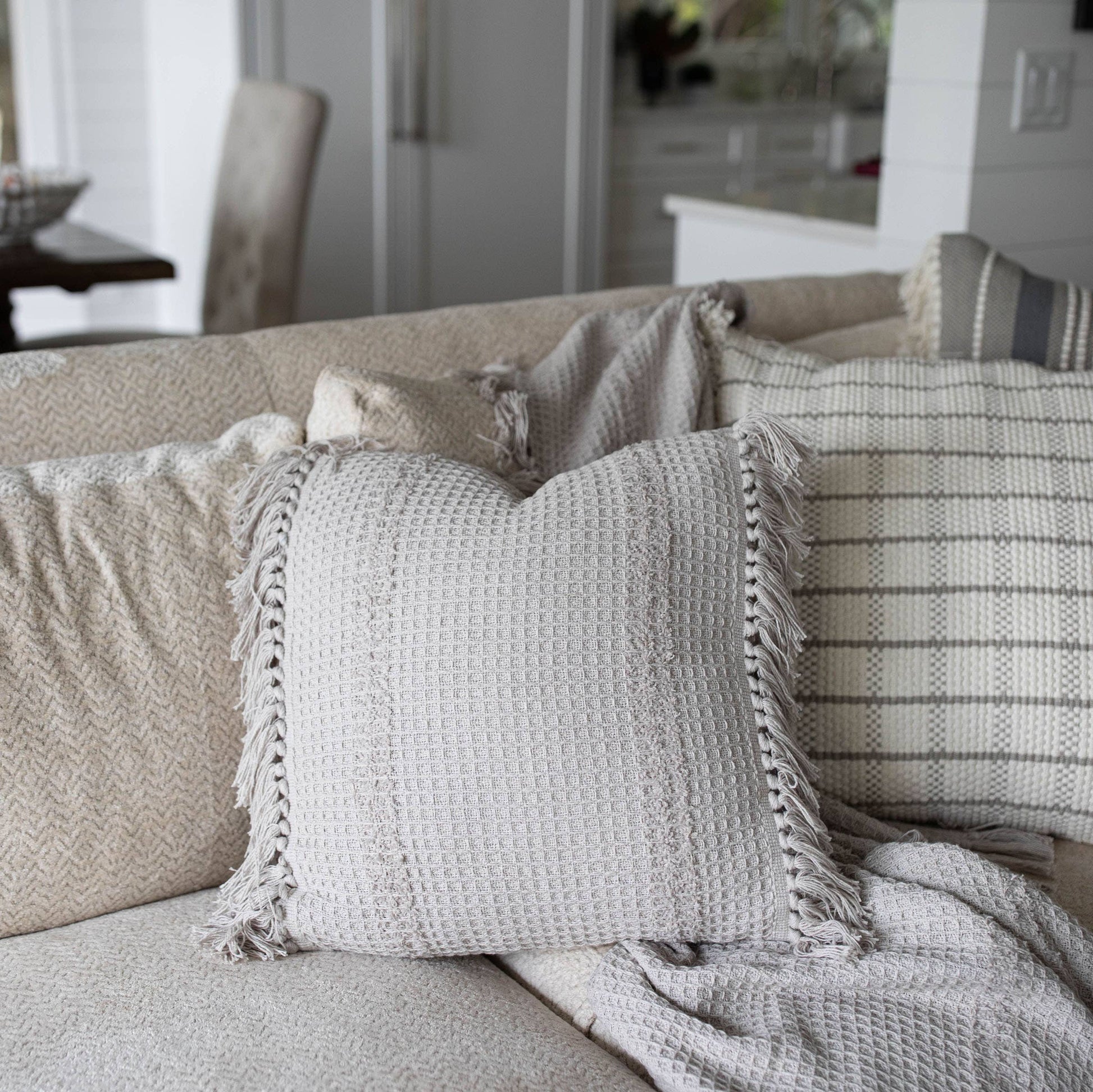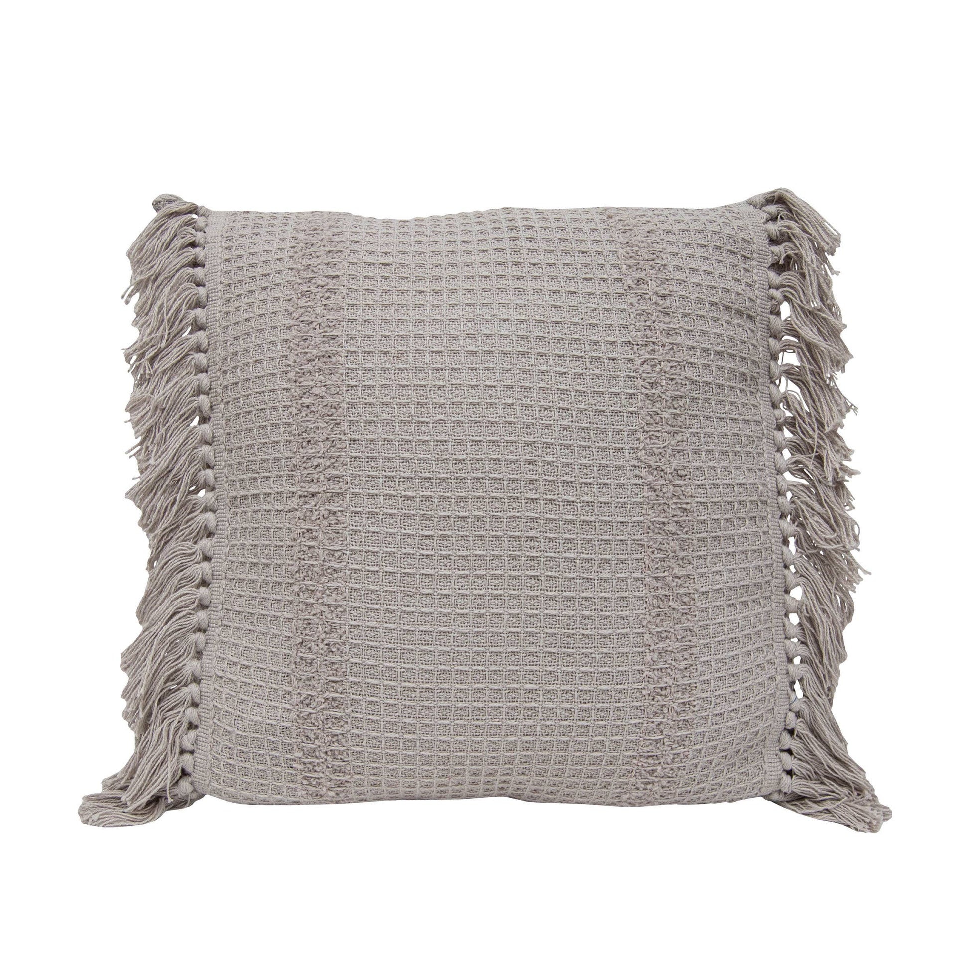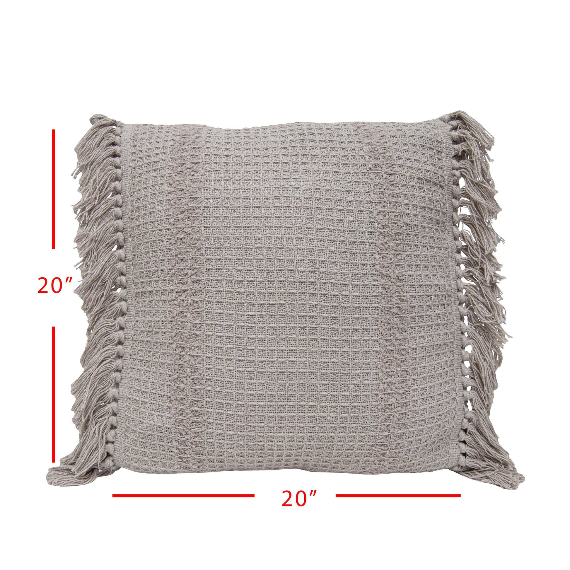 This soft, light gray pillow is a traditional one with a cozy, casual spin. The waffle weave throw pillow is woven with light gray yarns, frayed stripe accents and tassels on each end. This is one pillow that will transition from season to season. Hand woven by artisans in India. -20” size is perfect base for layering with smaller pillows or for use as a solo statement pillow. Handwoven in India. Handloomed by artisans using techniques passed down through generations. -Spot Clean Only. -Please note: This pillow is shipped vacuum packed with a premium fill. Once opened, please allow 24 hours for the pillow to restore to its natural state. Fluff pillow manually if desired. -Dimensions: 20 x 20 x 5"H -Materials: Cotton With Polyester Fill -A gray waffle weave pillow with braided tassels. -Complements your traditional style home.