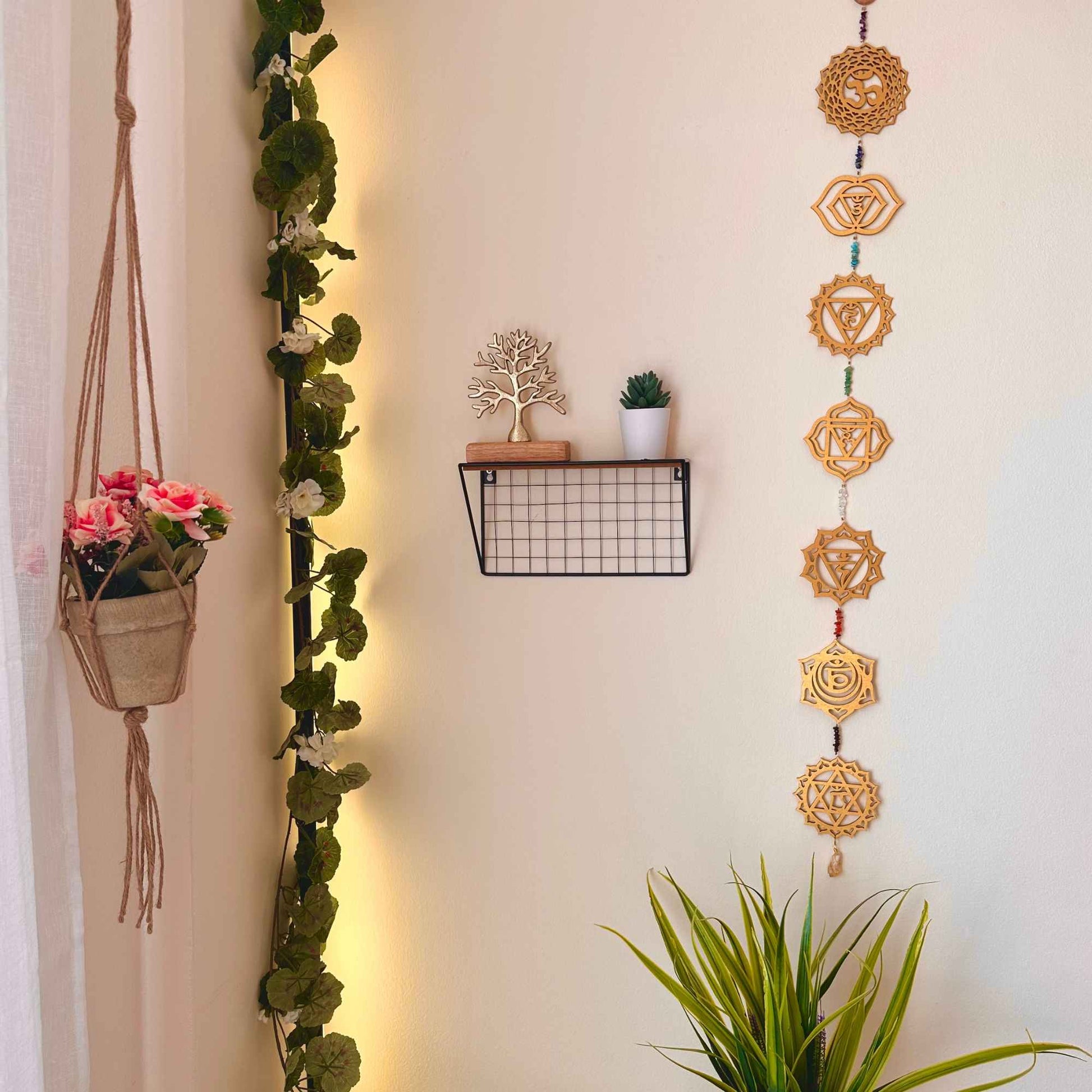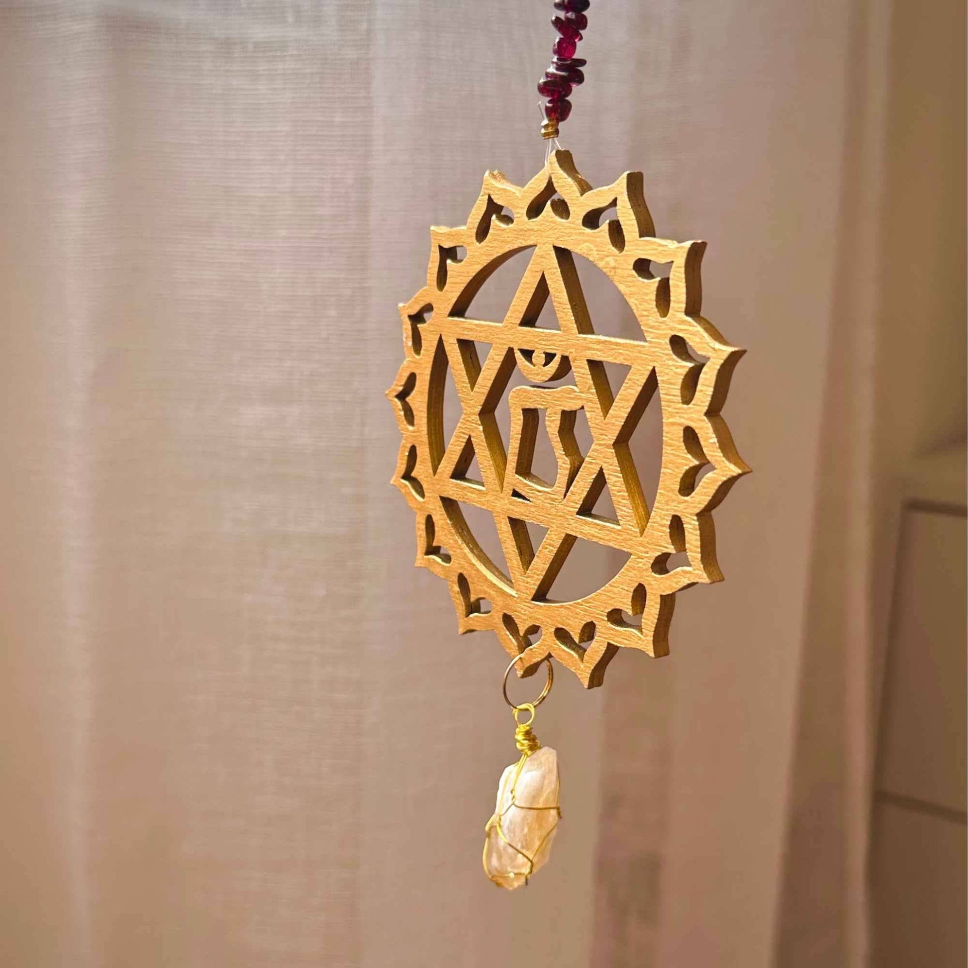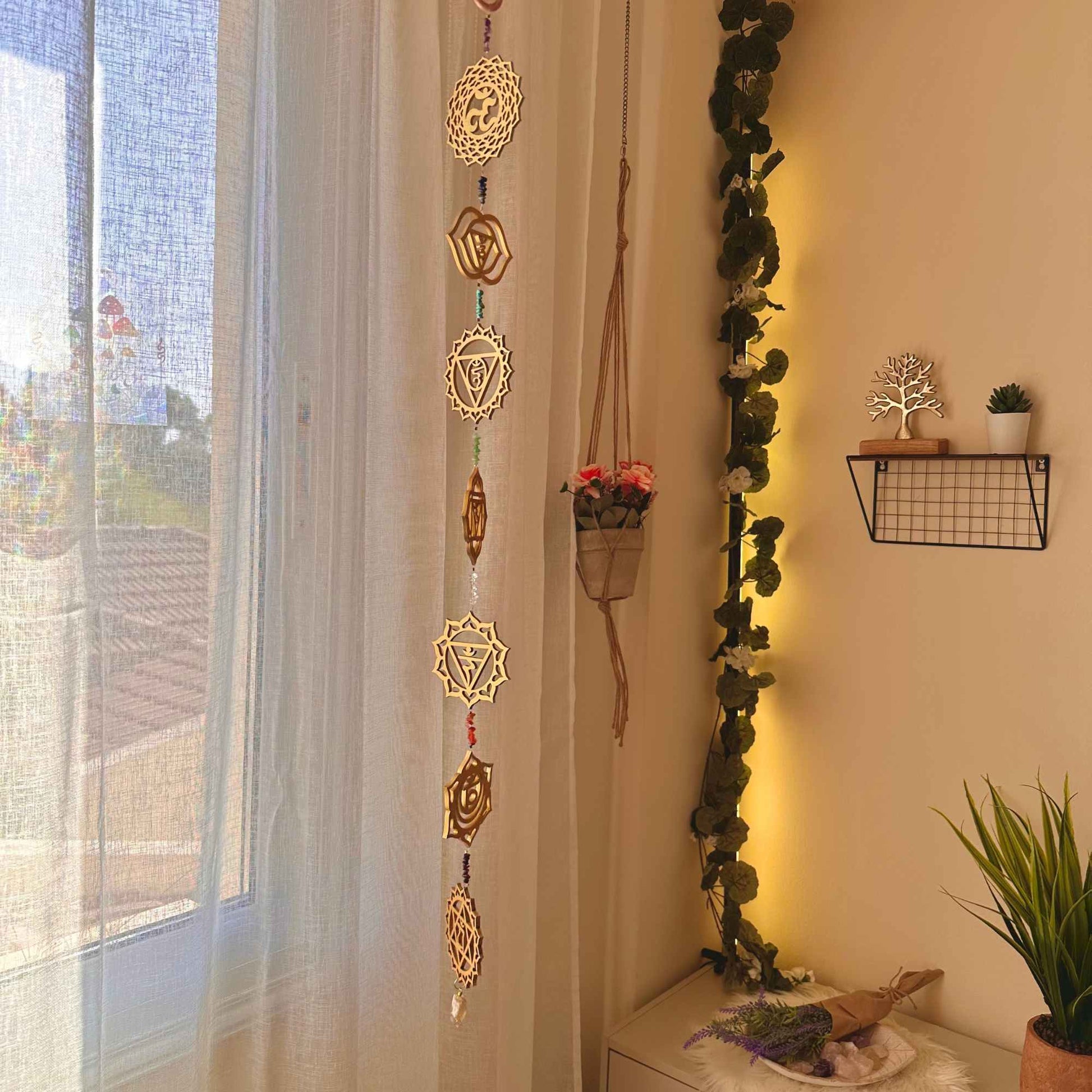 It features wooden chakra symbols and authentic crystals 🔮 that work together to create an atmosphere of zen.